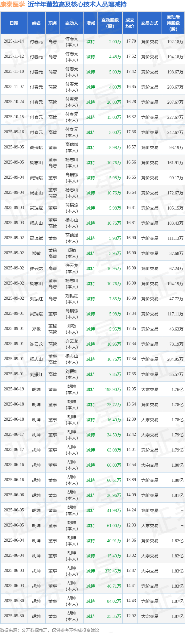 康泰医学近半年内的董监高及核心技术人员增减持详情如下: