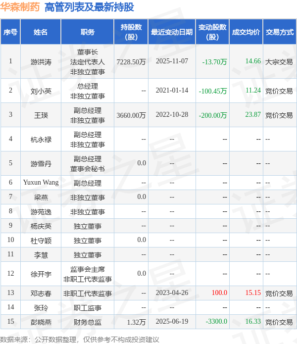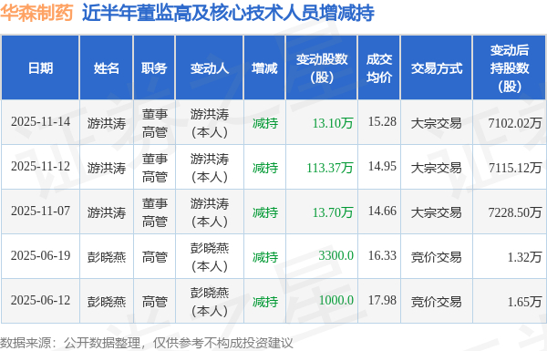 华森制药近半年内的董监高及核心技术人员增减持详情如下: