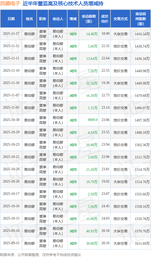 民德电子近半年内的董监高及核心技术人员增减持详情如下:
