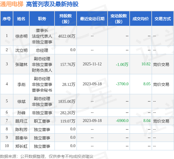 通用电梯近半年内的董监高及核心技术人员增减持详情如下: