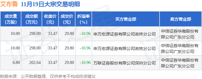 证券之星消息,11月19日艾布鲁发生大宗交易,交易数据如下: