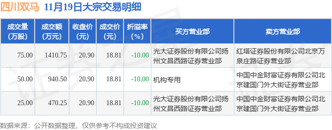 证券之星消息,11月19日四川双马发生大宗交易,交易数据如下: