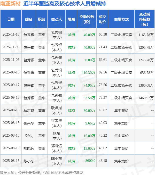 证券之星消息,根据11月19日市场公开信息、上市公司公告及交易所披露数据整理,南亚新材(688519)最新董监高及相关人员股份变动情况:2025年11月18日公司董事包秀银共减持公司股份40.0万股,占公司总股本为0.1704%。变动期间公司股价上涨4.04%,11月18日当日收盘报66.38元。