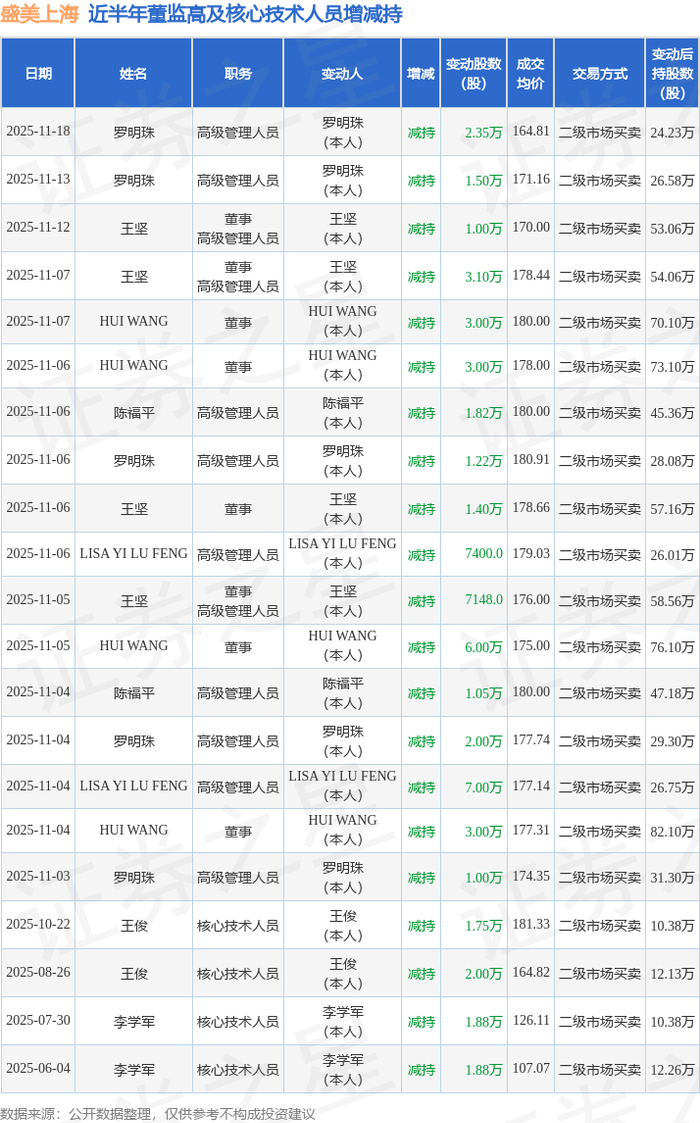盛美上海近半年内的董监高及核心技术人员增减持详情如下: