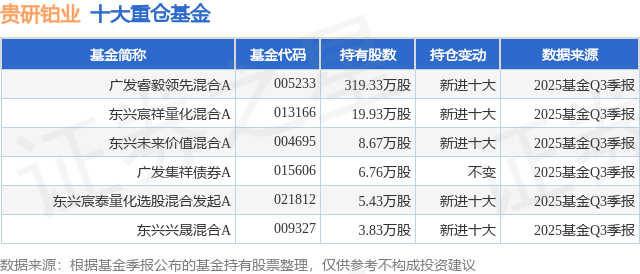 根据2025基金Q3季报公募基金重仓股数据,重仓该股的公募基金共6家,其中持有数量最多的公募基金为广发基金的广发睿毅领先混合A。广发睿毅领先混合A目前规模为12.27亿元,最新净值2.6057(11月19日),较上一交易日上涨0.04%,近一年上涨7.74%。该公募基金现任基金经理为林英睿。林英睿在任的基金产品包括:广发多策略混合,管理时间为2016年12月16日至今,期间收益率为92.55%;广发聚富混合,管理时间为2018年11月5日至今,期间收益率为85.23%;广发价值领先混合A,管理时间为2020年5月7日至今,期间收益率为72.37%。