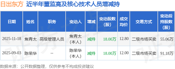 日出东方近半年内的董监高及核心技术人员增减持详情如下: