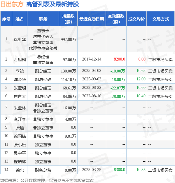 日出东方的高管列表及最新持股情况如下:
