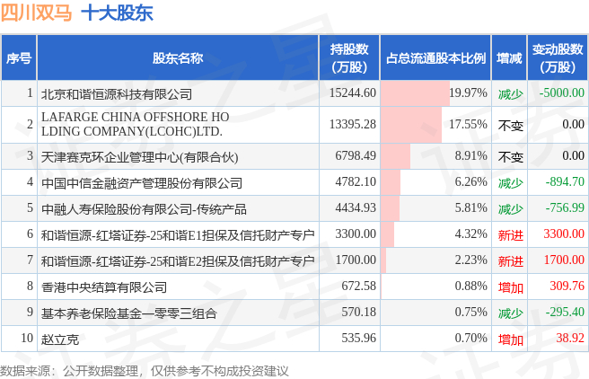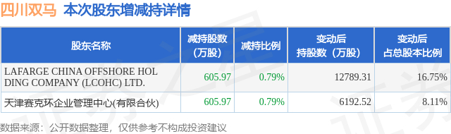证券之星消息,11月20日四川双马发布公告《四川双马:关于持股5%以上股东减持股份触及1%整数倍的公告》,其股东LAFARGE CHINA OFFSHORE HOLDING COMPANY (LCOHC) LTD.、天津赛克环企业管理中心(有限合伙)于2025年10月31日至2025年11月20日间合计减持1211.94万股,占公司目前总股本的1.5874%,变动期间该股股价上涨7.54%,截止11月20日收盘报21.53元。