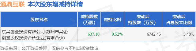 证券之星消息,11月20日通鼎互联发布公告《通鼎互联:关于持股5%以上股东减持计划期限届满暨实施情况的公告》,其股东东吴创业投资有限公司-苏州市吴企创基股权投资合伙企业(有限合伙)于2025年9月17日至2025年11月19日间合计减持637.1万股,占公司目前总股本的0.518%,变动期间该股股价下跌18.24%,截止11月19日收盘报5.2元。