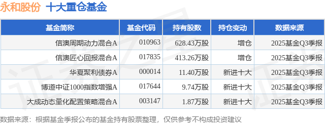 根据2025基金Q3季报公募基金重仓股数据,重仓该股的公募基金共5家,其中持有数量最多的公募基金为信达澳亚基金的信澳周期动力混合A。信澳周期动力混合A目前规模为8.05亿元,最新净值1.8042(11月20日),较上一交易日下跌1.28%,近一年上涨50.45%。该公募基金现任基金经理为吴清宇 张明烨。吴清宇在任的基金产品包括:信澳景气优选混合A,管理时间为2021年12月21日至今,期间收益率为57.19%;信澳优势产业混合A,管理时间为2023年5月29日至今,期间收益率为117.98%;信澳匠心严选一年持有混合A,管理时间为2024年11月29日至今,期间收益率为83.3%。张明烨在任的基金产品包括:信澳匠心回报混合A,管理时间为2024年3月11日至今,期间收益率为105.77%;