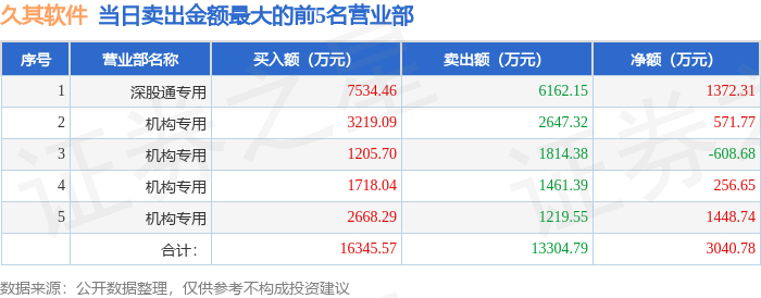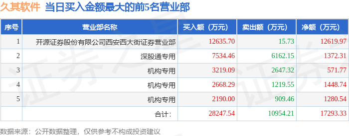 证券之星消息,沪深交易所2025年11月21日公布的交易公开信息显示,久其软件(002279)因日涨幅偏离值达到7%的前5只证券登上龙虎榜。此次是近5个交易日内第1次上榜。