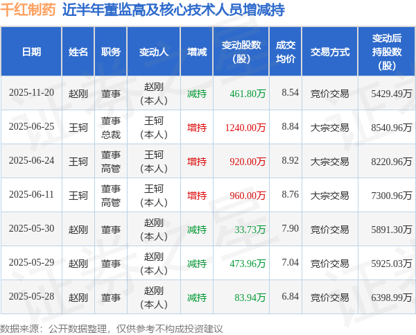 证券之星消息,根据11月21日市场公开信息、上市公司公告及交易所披露数据整理,千红制药(002550)最新董监高及相关人员股份变动情况:2025年11月20日公司董事赵刚共减持公司股份461.8万股,占公司总股本为0.3608%。变动期间公司股价下跌0.12%,11月20日当日收盘报8.53元。