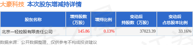 证券之星消息,11月21日大豪科技发布公告《大豪科技:北京大豪科技股份有限公司关于控股股东增持公司股份的进展公告》,其股东北京一轻控股有限责任公司于2025年9月2日至2025年11月20日间合计增持145.86万股,占公司目前总股本的0.1306%,变动期间该股股价上涨5.56%,截止11月20日收盘报17.67元。