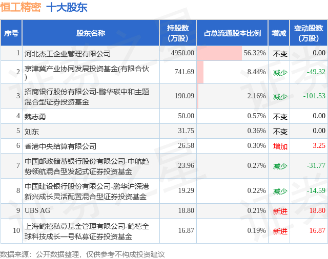 根据恒工精密2025年三季报公布的十大股东详情如下: