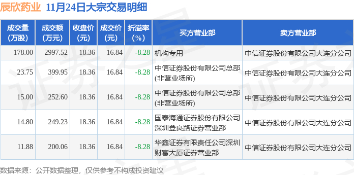 证券之星消息,11月24日辰欣药业发生大宗交易,交易数据如下: