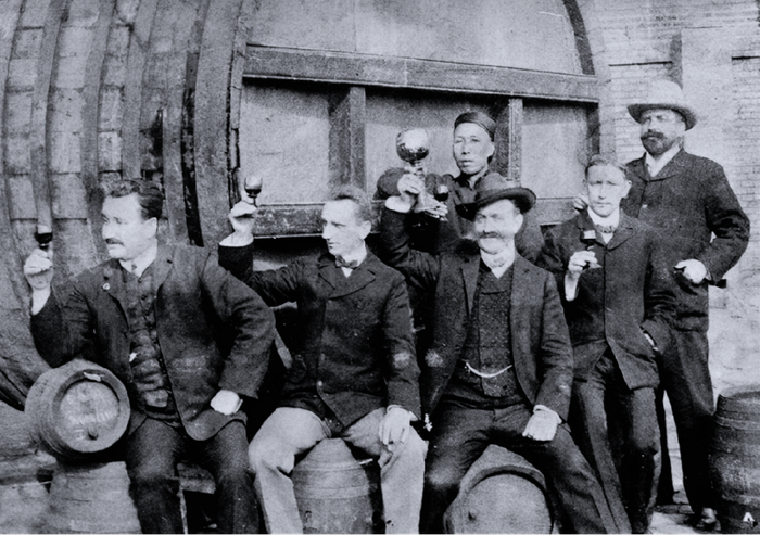 1914年,张裕首位酿酒师巴保(第二排右一)、张裕首任总经理张成卿(第二排左一)与众多酿酒师举杯庆祝中国第一桶白兰地诞生。