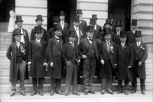 1915年5年月26日,美国国务卿勃拉恩(William Jennings Bryan,前排左二)、驻美公使夏偕复(前排左四)与张弼士(前排左三)率领的中华游美实业团在白宫留影。