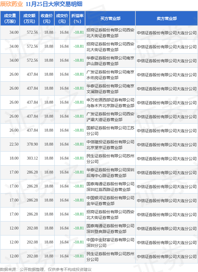 证券之星消息,11月25日辰欣药业发生大宗交易,交易数据如下: