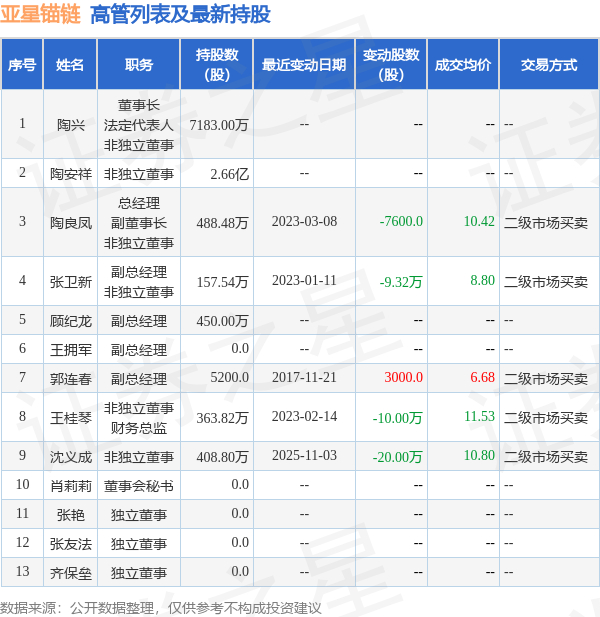 亚星锚链近半年内的董监高及核心技术人员增减持详情如下: