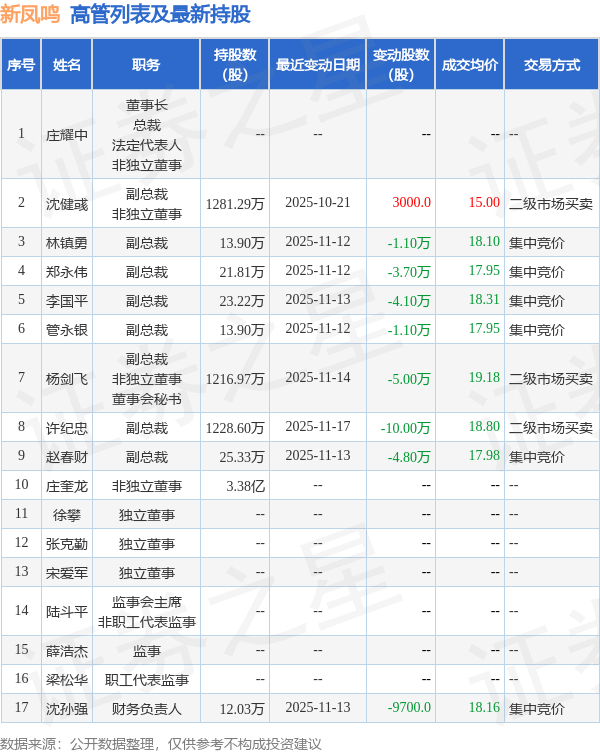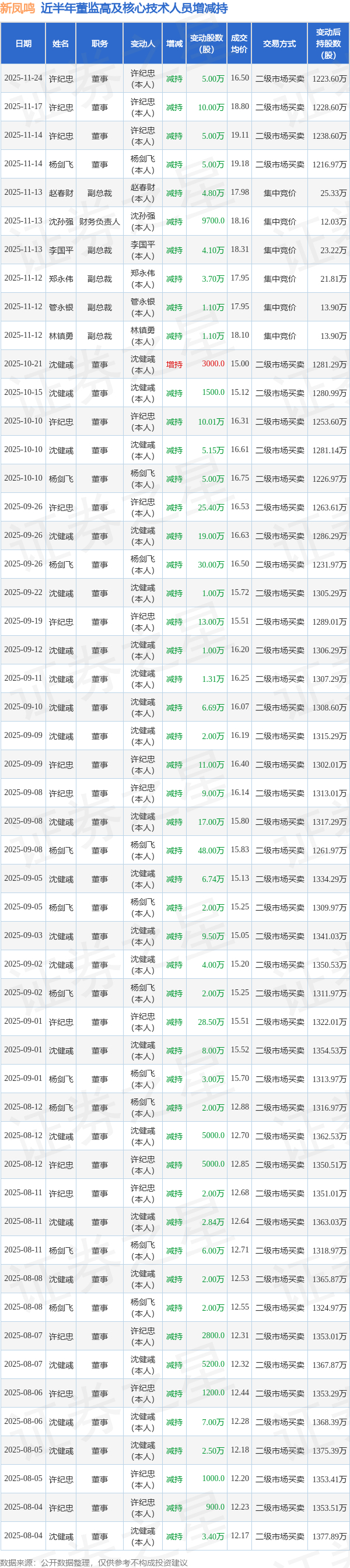 证券之星消息,根据11月25日市场公开信息、上市公司公告及交易所披露数据整理,新凤鸣(603225)最新董监高及相关人员股份变动情况:2025年11月24日公司董事许纪忠共减持公司股份5.0万股,占公司总股本为0.0033%。变动期间公司股价上涨1.85%,11月24日当日收盘报16.54元。