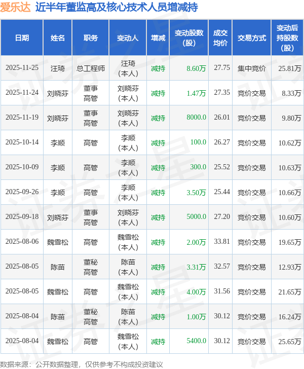 爱乐达近半年内的董监高及核心技术人员增减持详情如下: