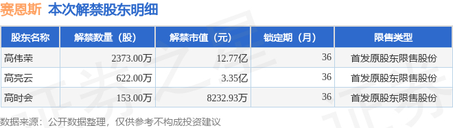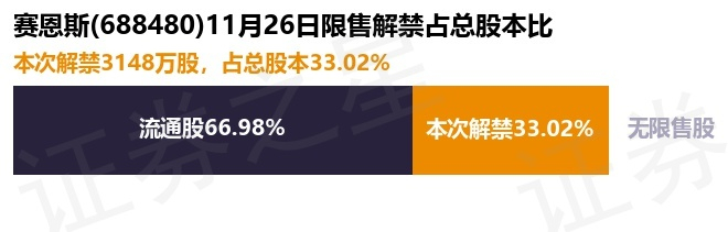 证券之星消息,根据市场公开信息整理,赛恩斯(688480)于11月26日将有3148.0万股限售股份解禁,为公司首发原股东限售股份,占公司总股本33.02%。(本次数据根据历史公告整理得出,实际情况以上市公司最新公告为准)本次解禁后,公司已无限售股份。具体如下图所示: