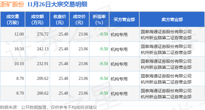 证券之星消息,11月26日浙矿股份发生大宗交易,交易数据如下: