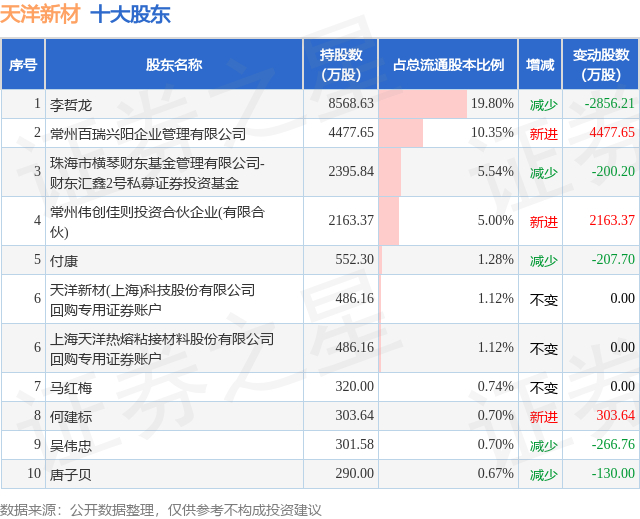 根据天洋新材2025年三季报公布的十大股东详情如下: