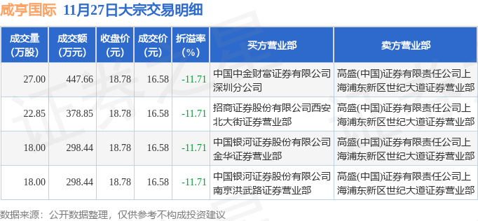 证券之星消息,11月27日咸亨国际发生大宗交易,交易数据如下: