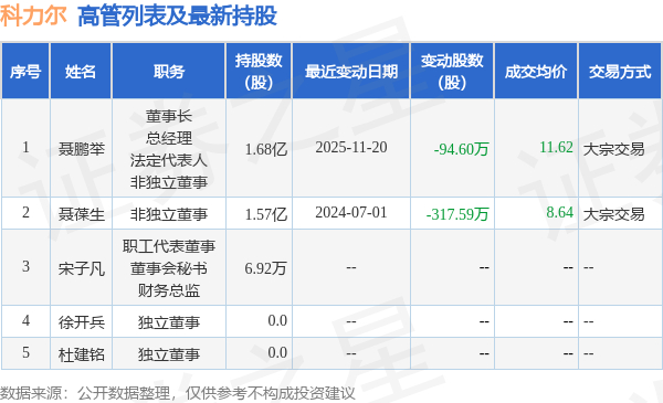 科力尔近半年内的董监高及核心技术人员增减持详情如下: