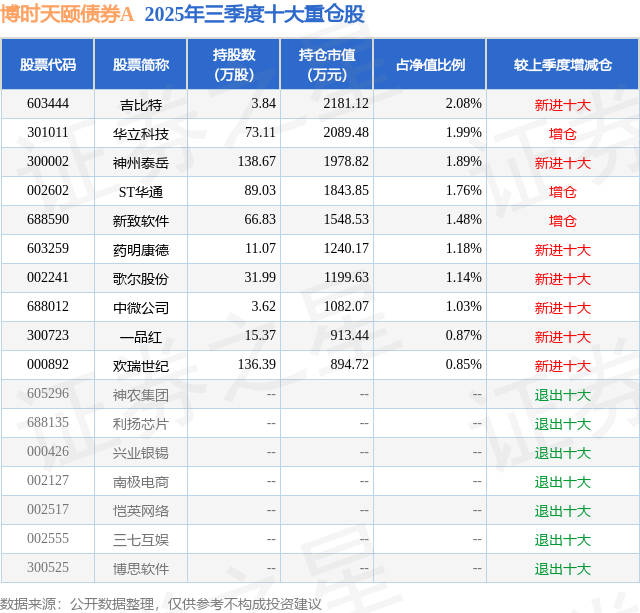 博时天颐债券A的前十大重仓股如下:
