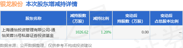 证券之星消息,11月28日银龙股份发布公告《银龙股份:天津银龙预应力材料股份有限公司关于控股股东、实际控制人之一致行动人权益变动触及1%刻度暨减持股份结果公告》,其股东上海通怡投资管理有限公司-通怡芙蓉16号私募证券投资基金于2025年11月26日至2025年11月28日间合计减持1026.62万股,占公司目前总股本的1.1974%,变动期间该股股价上涨5.38%,截止11月28日收盘报9.79元。