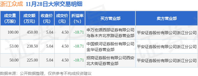 证券之星消息,11月28日浙江众成发生大宗交易,交易数据如下: