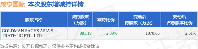 证券之星消息,11月28日咸亨国际发布公告《咸亨国际:关于5%以上股东减持结果公告》,其股东GOLDMAN SACHS ASIA STRATEGIC PTE. LTD.于2025年9月12日至2025年11月27日间合计减持981.19万股,占公司目前总股本的2.3915%,变动期间该股股价上涨33.67%,截止11月27日收盘报18.78元。