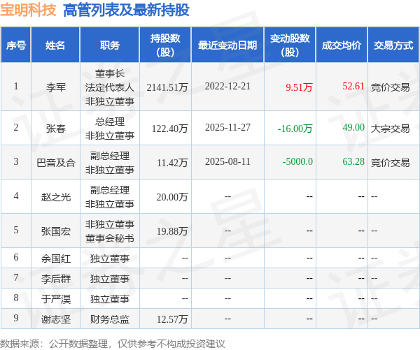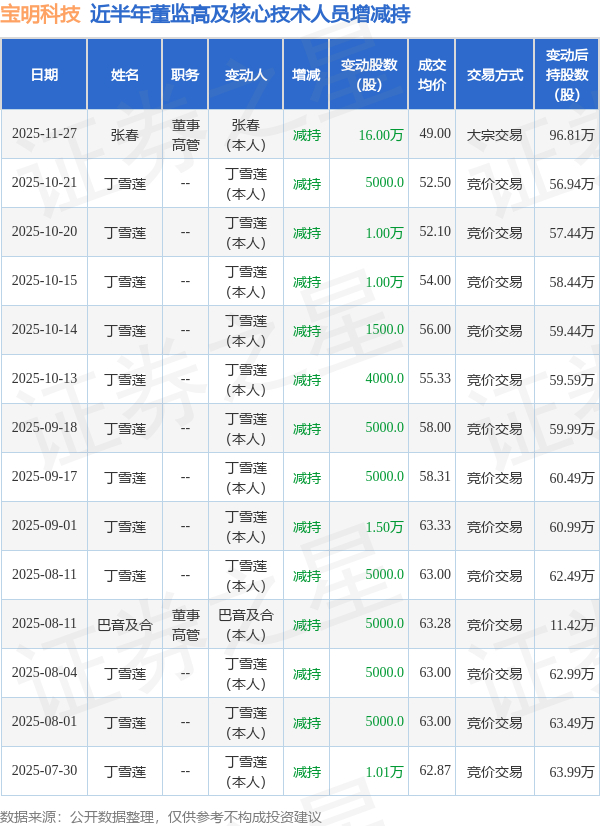 宝明科技近半年内的董监高及核心技术人员增减持详情如下: