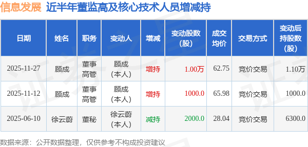 证券之星消息,根据11月28日市场公开信息、上市公司公告及交易所披露数据整理,信息发展(300469)最新董监高及相关人员股份变动情况:2025年11月27日公司董事,高管顾成共增持公司股份1.0万股,占公司总股本为0.004%。变动期间公司股价上涨1.08%,11月27日当日收盘报62.67元。