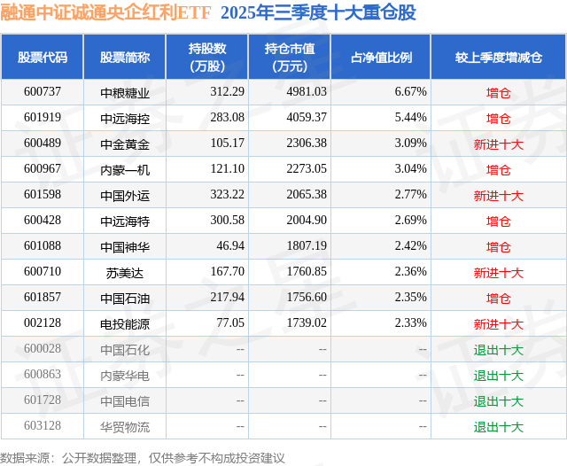 根据2025基金Q3季报公募基金重仓股数据,重仓该股的公募基金共4家,其中持有数量最多的公募基金为融通基金的融通中证诚通央企红利ETF。融通中证诚通央企红利ETF目前规模为7.47亿元,最新净值1.1054(11月28日),较上一交易日上涨0.54%。该公募基金现任基金经理为蔡志伟 吕寒。蔡志伟在任的基金产品包括:融通巨潮100指数A(LOF),管理时间为2015年2月11日至今,期间收益率为83.28%;融通深证成份指数A,管理时间为2016年11月19日至今,期间收益率为53.98%;融通创业板指数A,管理时间为2016年11月19日至今,期间收益率为38.03%;融通创业板ETF,管理时间为2020年8月12日至今,期间收益率为17.11%。吕寒在任的基金产品包括:融通创业板ETF,管理时间为2023年9月12日至今,期间收益率为51.3%;融通创业板指数A,管理时间为2023年9月12日至今,期间收益率为50.54%;融通中证诚通央企科技创新ETF,管理时间为2024年8月22日至今,期间收益率为28.67%;融通中证诚通央企ESGETF,管理时间为2024年12月5日至今,期间收益率为7.14%。