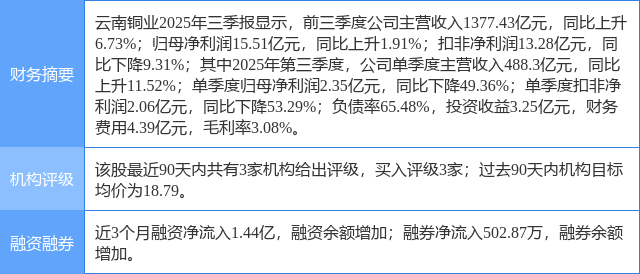 2025年9月30日,民生证券研究员邱祖学,袁浩发布了对云南铜业的研报《公司动态报告:业绩稳健,凉山矿业注入在即》,该研报对云南铜业给出“买入”评级。研报中预计2025-2027年公司实现归母净利润17.79/23.03/28.71亿元,对应2025年9月29日收盘价的PE分别为18/14/11倍,首次覆盖,给予“推荐”评级。证券之星数据中心根据近三年发布的研报数据计算,该研报作者对此股的盈利预测准确度为36.42%。
