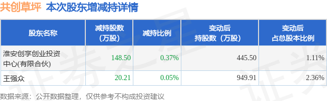 证券之星消息,12月1日共创草坪发布公告《共创草坪:股东减持股份结果公告》,其股东淮安创享创业投资中心(有限合伙)、王强众于2025年9月1日至2025年11月30日间合计减持168.71万股,占公司目前总股本的0.4191%,变动期间该股股价上涨11.81%,截止11月28日收盘报36.25元。
