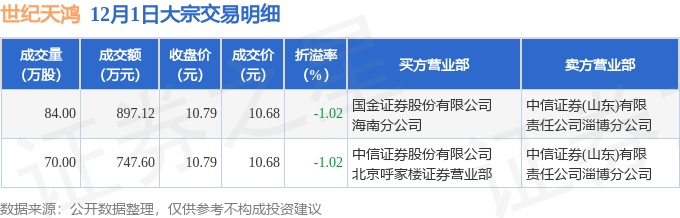 证券之星消息,12月1日世纪天鸿发生大宗交易,交易数据如下: