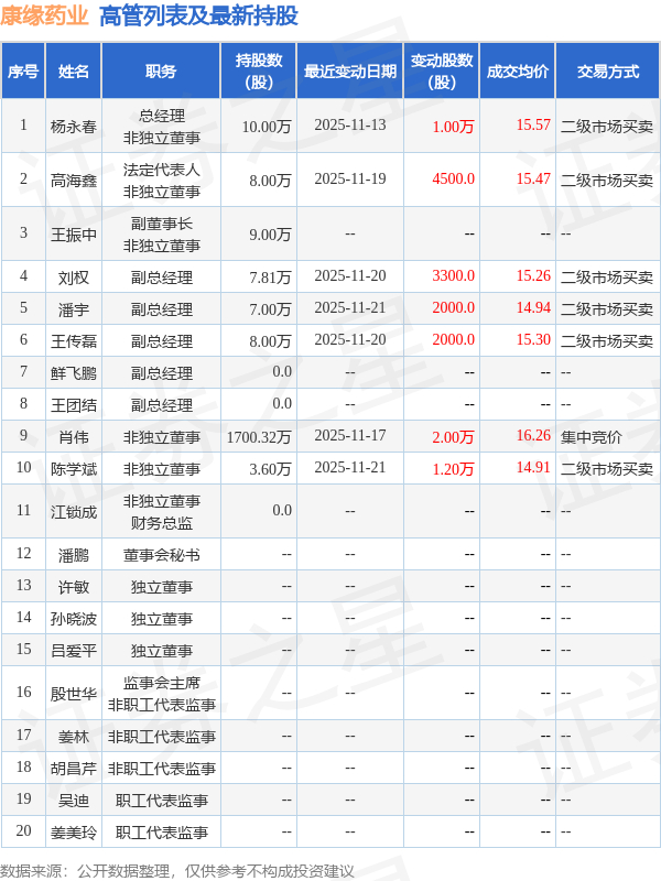 证券之星消息,根据12月1日市场公开信息、上市公司公告及交易所披露数据整理,康缘药业(600557)最新董监高及相关人员股份变动情况:2025年11月27日至2025年11月28日公司高级管理人员潘宇、董事陈学斌共增持公司股份5000.0股,占公司总股本为0.0009%。变动期间公司股价下跌2.46%,11月28日当日收盘报15.08元。