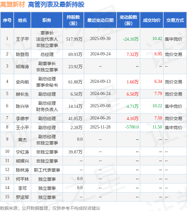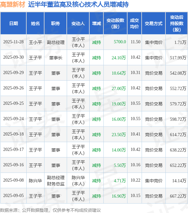 高盟新材近半年内的董监高及核心技术人员增减持详情如下: