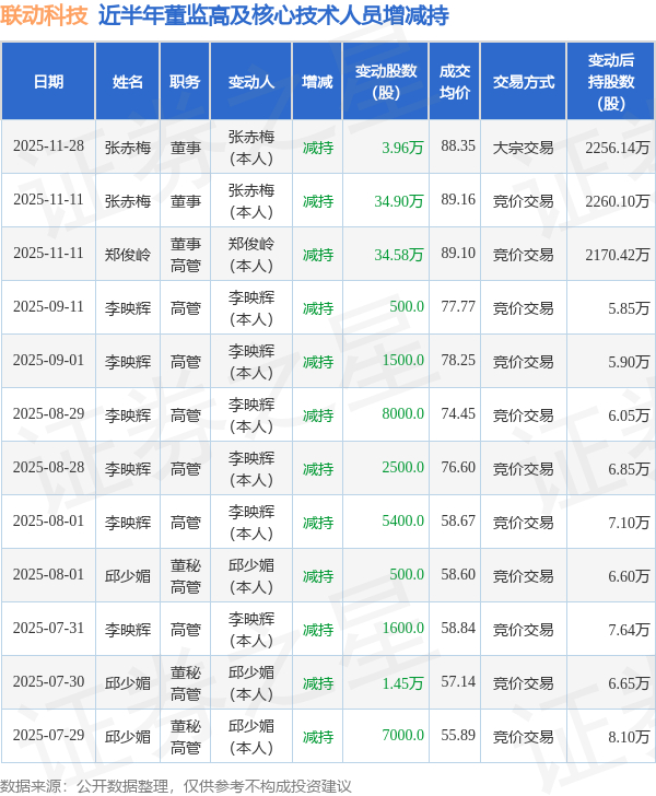 联动科技近半年内的董监高及核心技术人员增减持详情如下: