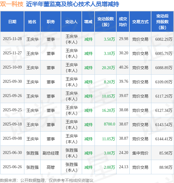双一科技近半年内的董监高及核心技术人员增减持详情如下: