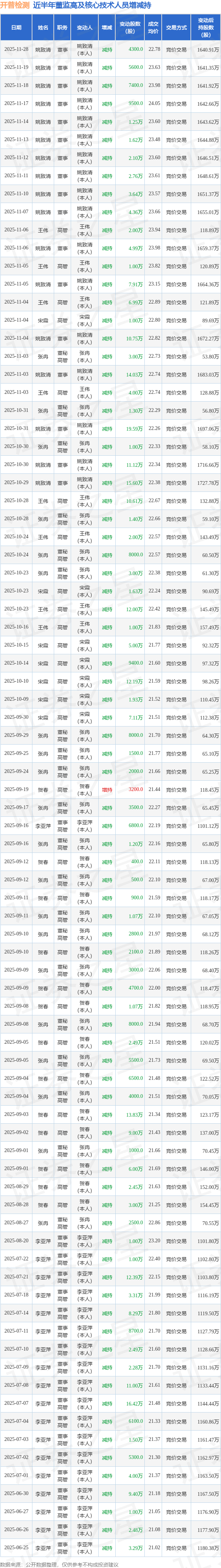 开普检测近半年内的董监高及核心技术人员增减持详情如下:
