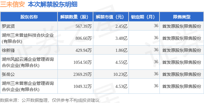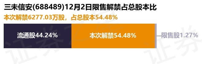 证券之星消息,根据市场公开信息整理,三未信安(688489)于12月2日将有6277.03万股限售股份解禁,为公司首发原股东限售股份,占公司总股本54.48%。(本次数据根据历史公告整理得出,实际情况以上市公司最新公告为准)最近一年内,该股累计解禁112.56万股,占总股本的0.98%。本次解禁后,公司还有146.52万股限售股份,占总股本1.27%。具体如下图所示: