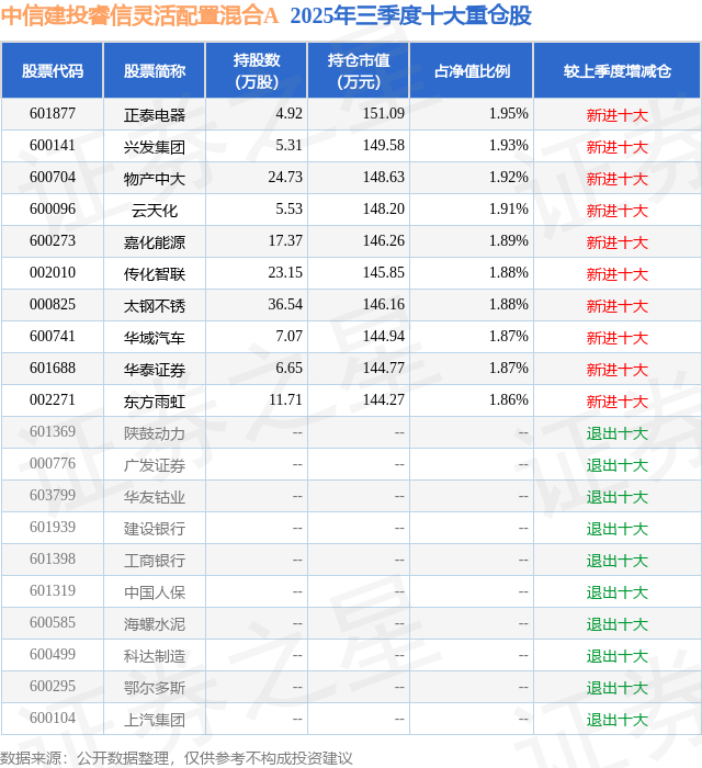根据2025基金Q3季报公募基金重仓股数据,重仓该股的公募基金共1家,其中持有数量最多的公募基金为中信建投基金的中信建投睿信灵活配置混合A。中信建投睿信灵活配置混合A目前规模为0.31亿元,最新净值0.7542(12月1日),较上一交易日上涨0.59%,近一年上涨17.08%。该公募基金现任基金经理为杨志武 艾翀。艾翀在任的基金产品包括:中信建投睿利A,管理时间为2024年2月6日至今,期间收益率为90.44%;中信建投致远混合A,管理时间为2025年3月24日至今,期间收益率为27.0%;中信建投上证科创板综合指数增强A,管理时间为2025年6月24日至今,期间收益率为12.57%。杨志武在任的基金产品包括:中信建投睿利A,管理时间为2023年3月17日至今,期间收益率为41.36%;中信建投稳利混合A,管理时间为2023年8月11日至今,期间收益率为14.61%;中信建投双鑫债券A,管理时间为2023年8月11日至今,期间收益率为8.17%。