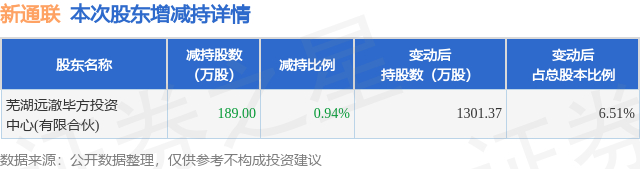 证券之星消息,12月2日新通联发布公告《新通联:新通联持股5%以上的股东权益变动触及1%刻度的提示性公告》,其股东芜湖远澈毕方投资中心(有限合伙)于2025年11月28日至2025年12月1日间合计减持189.0万股,占公司目前总股本的0.945%,变动期间该股股价上涨1.25%,截止12月1日收盘报10.51元。