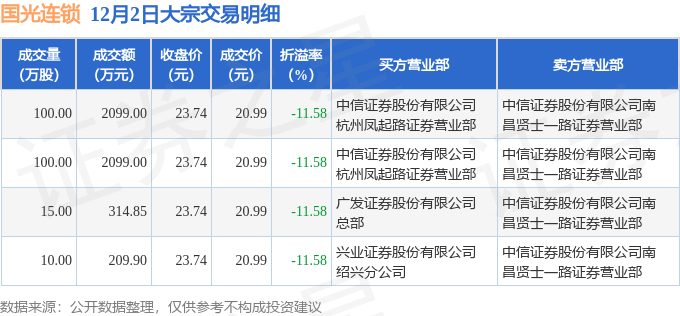 证券之星消息,12月2日国光连锁发生大宗交易,交易数据如下: