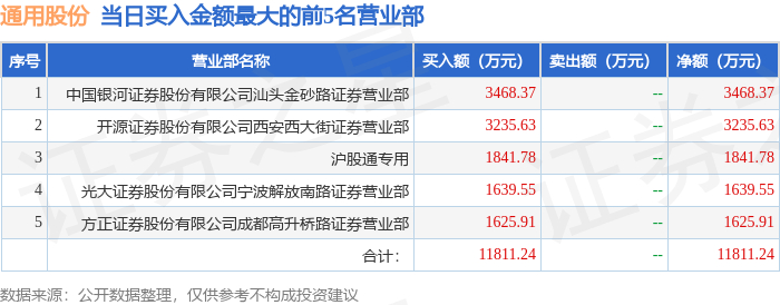 证券之星消息,沪深交易所2025年12月2日公布的交易公开信息显示,通用股份(601500)因有价格涨跌幅限制的日收盘价格涨幅偏离值达到7%的前五只证券登上龙虎榜。此次是近5个交易日内第1次上榜。